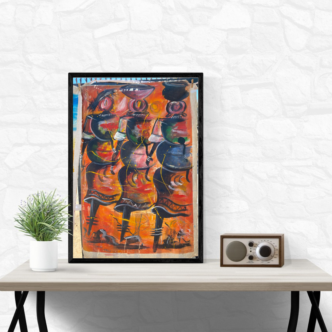 This vibrant artwork captures the movement and energy of African women in a bustling market scene. With bold strokes, warm earthy tones, and expressive figures, the piece celebrates the strength, grace, and daily rhythms of traditional life. The dynamic composition evokes a sense of harmony and cultural heritage, making it a striking centerpiece for any space.