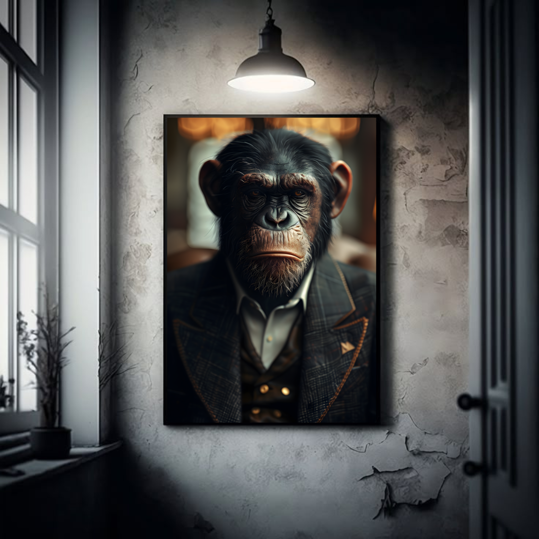 Elevate your space with “The Distinguished Gentleman,” a captivating high-quality canvas print that merges sophistication with untamed intellect. Featuring a sharply dressed primate exuding confidence and authority, this artwork brings a touch of class, mystery, and humor to any room. With rich textures and a moody ambiance, this statement piece is perfect for those who appreciate bold, conversation-starting decor. Ideal for offices, lounges, and creative spaces.