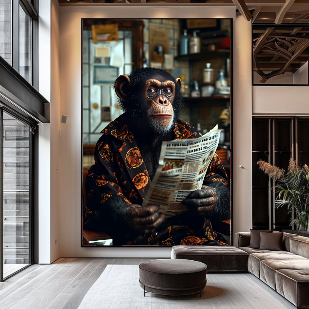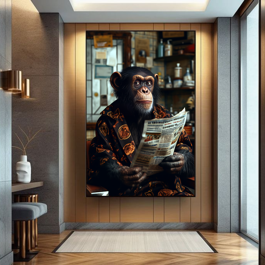 Elevate your space with “The Sophisticated Ape,” a bold and witty statement piece that blends intellect with style. Featuring a poised chimpanzee draped in a luxurious robe, leisurely reading a newspaper in a vintage café setting, this high-quality canvas print exudes charm, class, and a touch of humor. Perfect for modern interiors, creative spaces, or those who appreciate quirky yet elegant art, this masterpiece sparks conversation while adding a unique touch of sophistication.