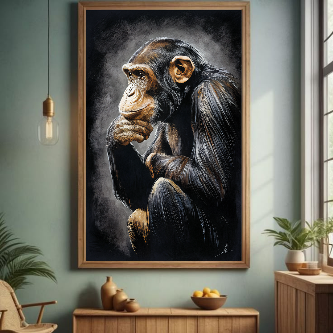 Unveil the essence of deep contemplation with “The Thinker: Primate Edition.” This stunning high-quality canvas print captures the wisdom and curiosity of a chimpanzee lost in thought, embodying intelligence, reflection, and the wonders of nature. With masterful brush strokes and a moody backdrop, this piece adds an artistic and intellectual charm to any space—whether in a study, office, or living room. A perfect statement for those who appreciate art that sparks thought and conversation.