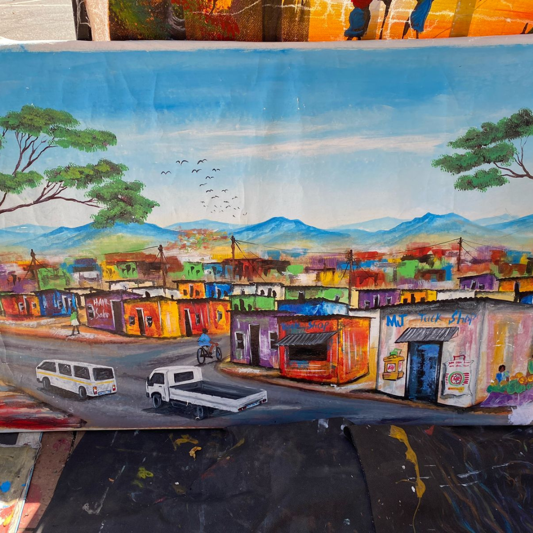 This captivating artwork beautifully portrays the heart and soul of township life. The colorful houses, bustling streets, and scenic mountain backdrop create a lively and nostalgic atmosphere. The piece highlights the community’s resilience, energy, and warmth, making it a perfect addition to any space celebrating culture and everyday beauty.